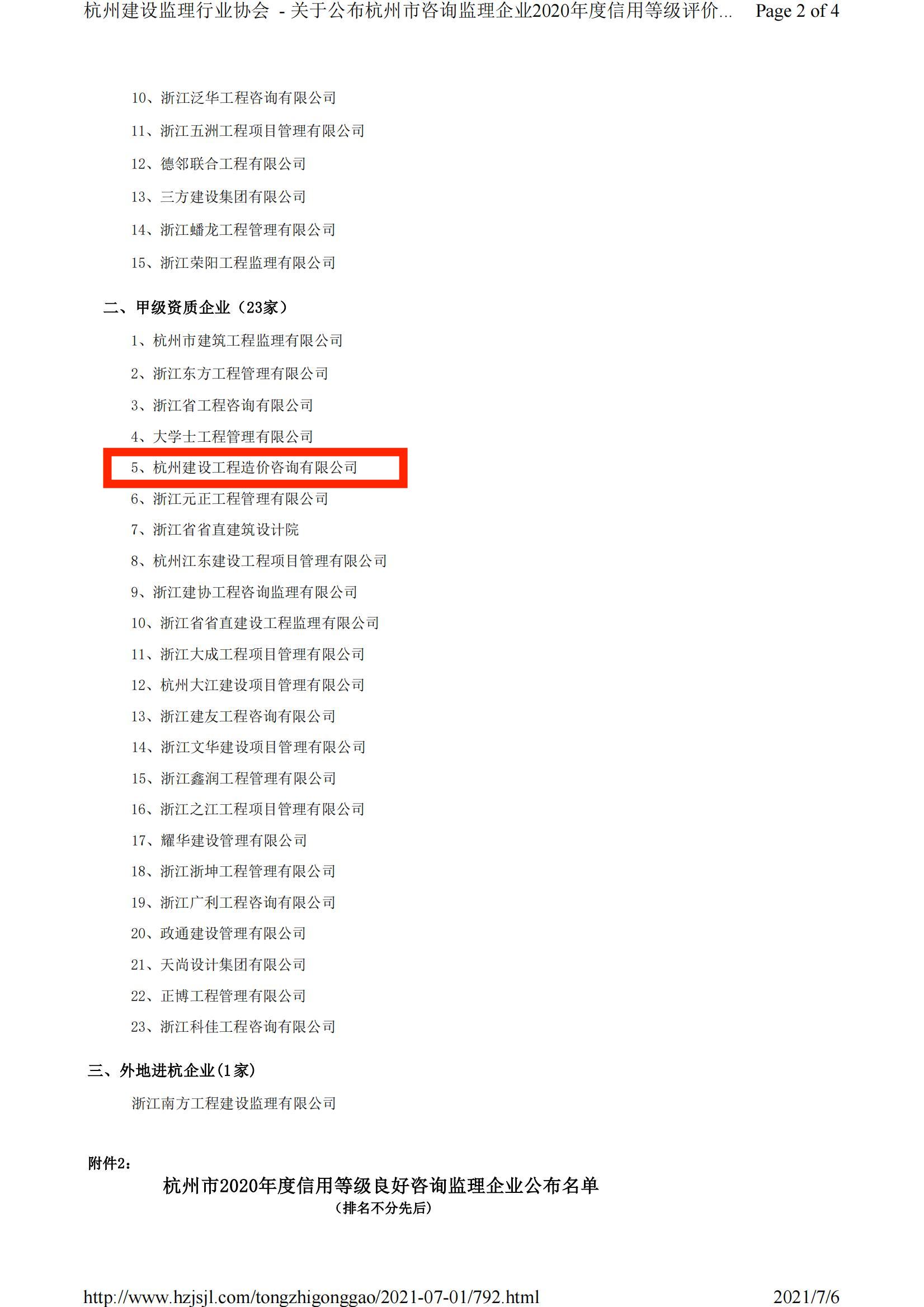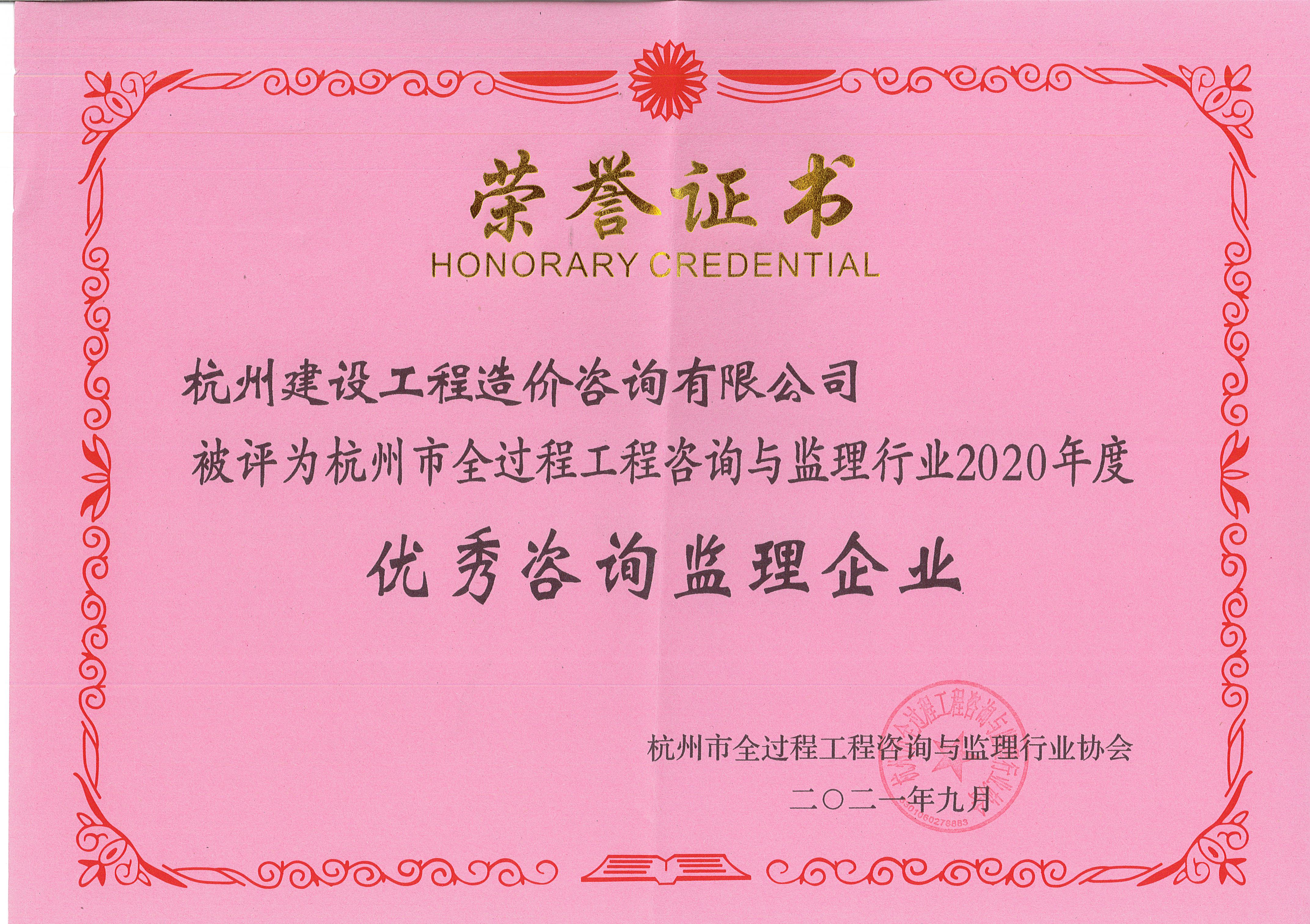 获评杭州市咨询监理企业2020年度信用等级评价优秀企业
