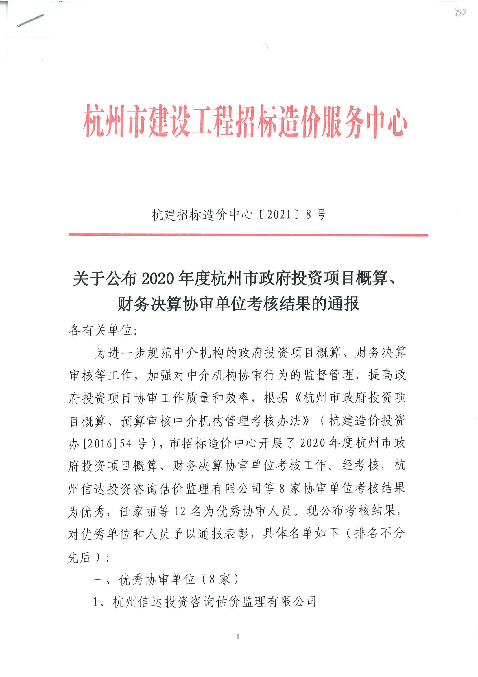 2020年度杭州市政府投资项目概算、财务决算协审单位考核结果