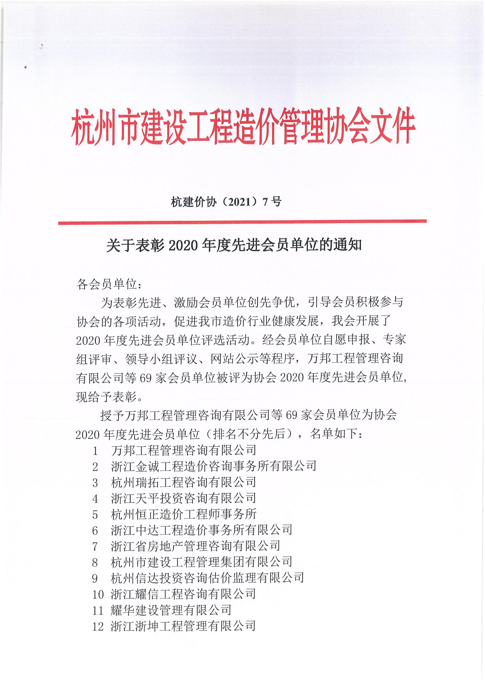 2020年度先进会员单位——杭州市建设工程造价管理协会