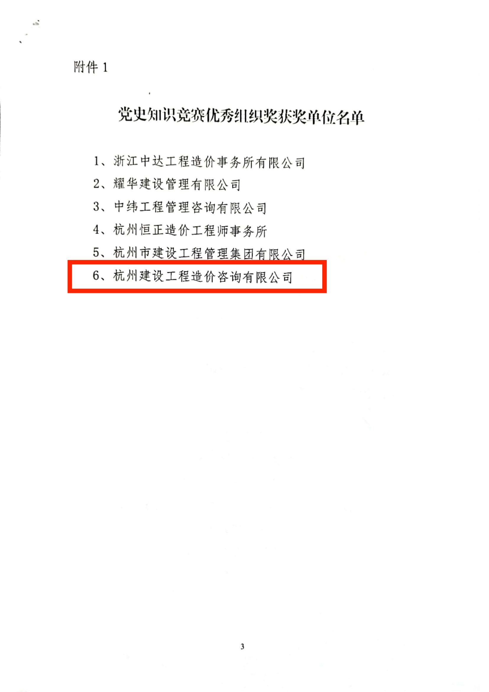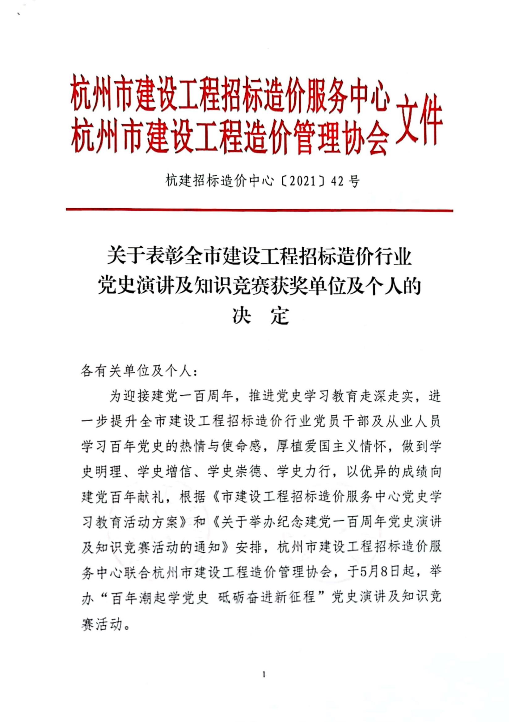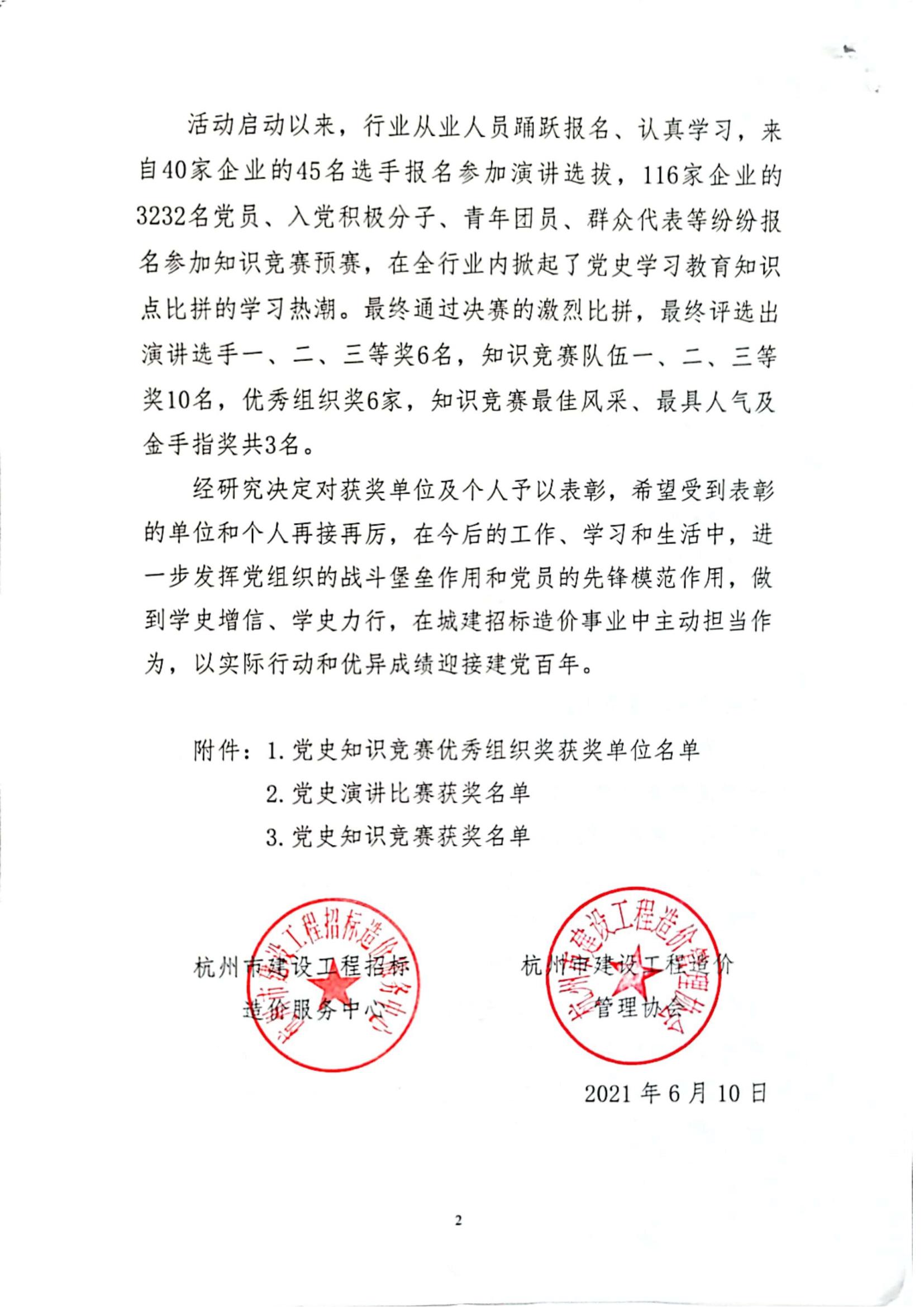 杭州市建设工程招标造价行业党史演讲及知识竞赛“优秀组织奖”