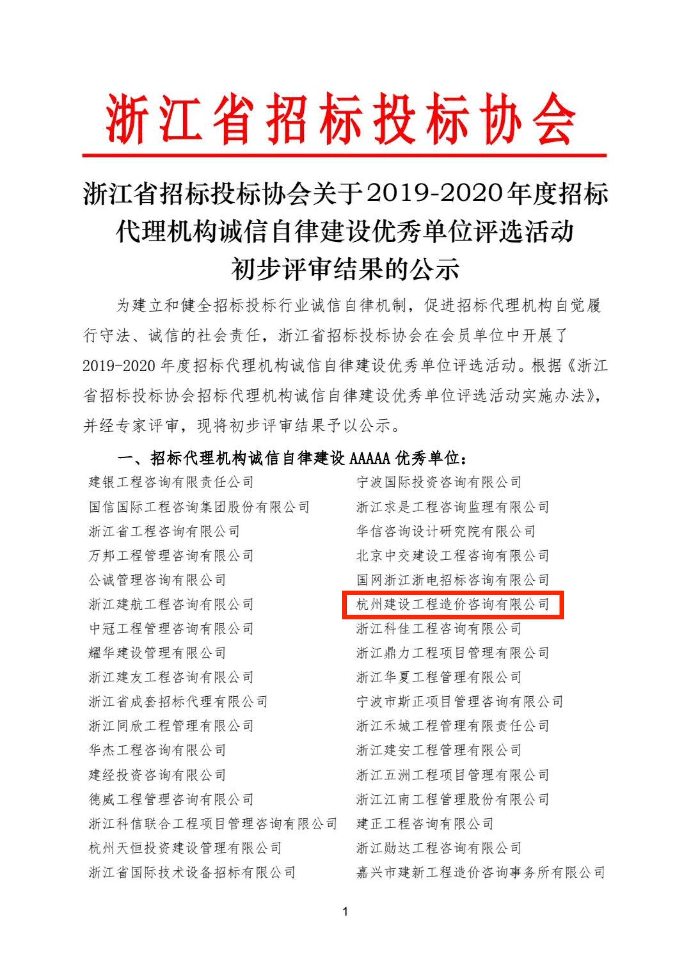 2019-2020年度招标代理机构诚信自律建设优秀单位AAAAA——浙江省招标投标协会