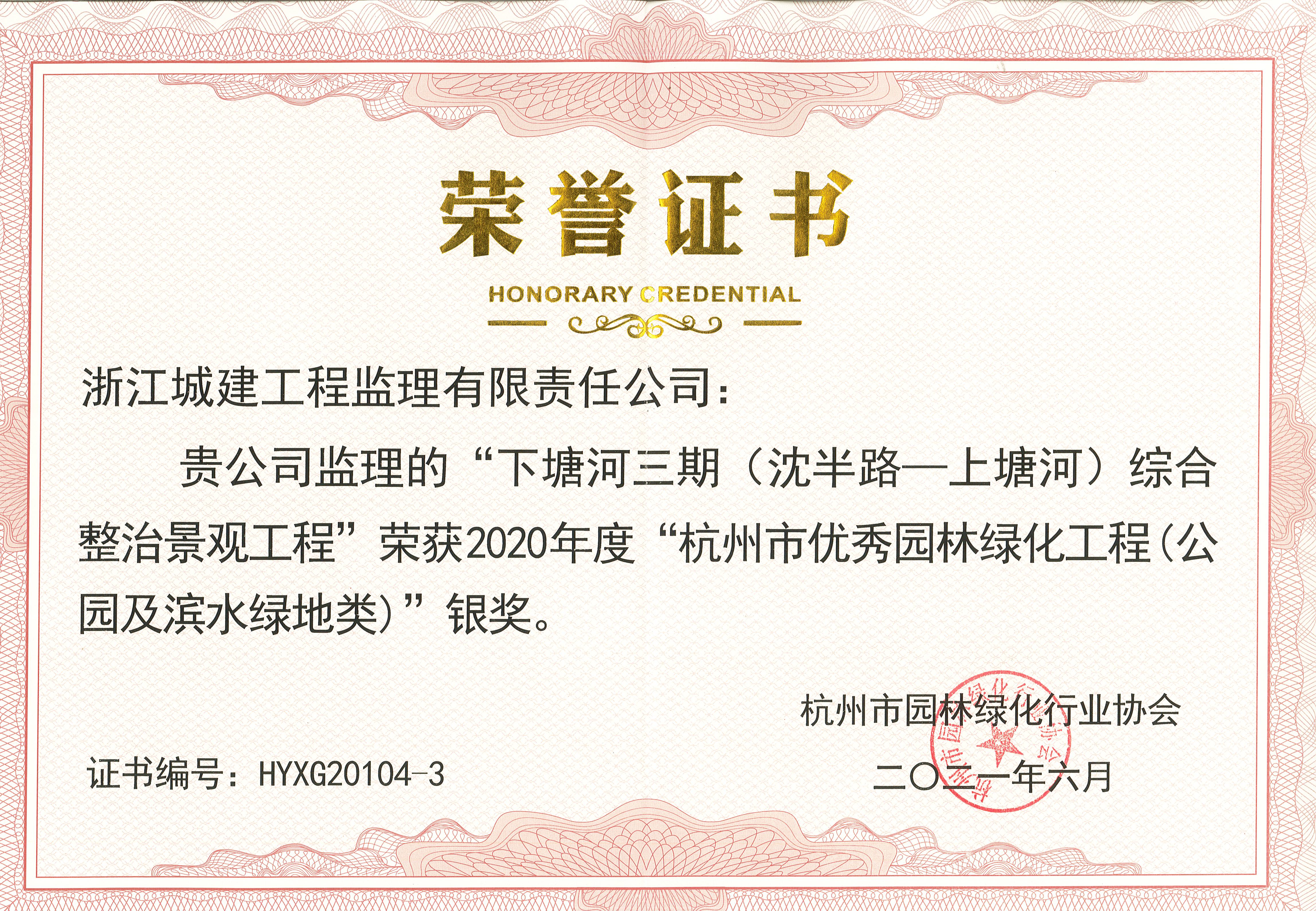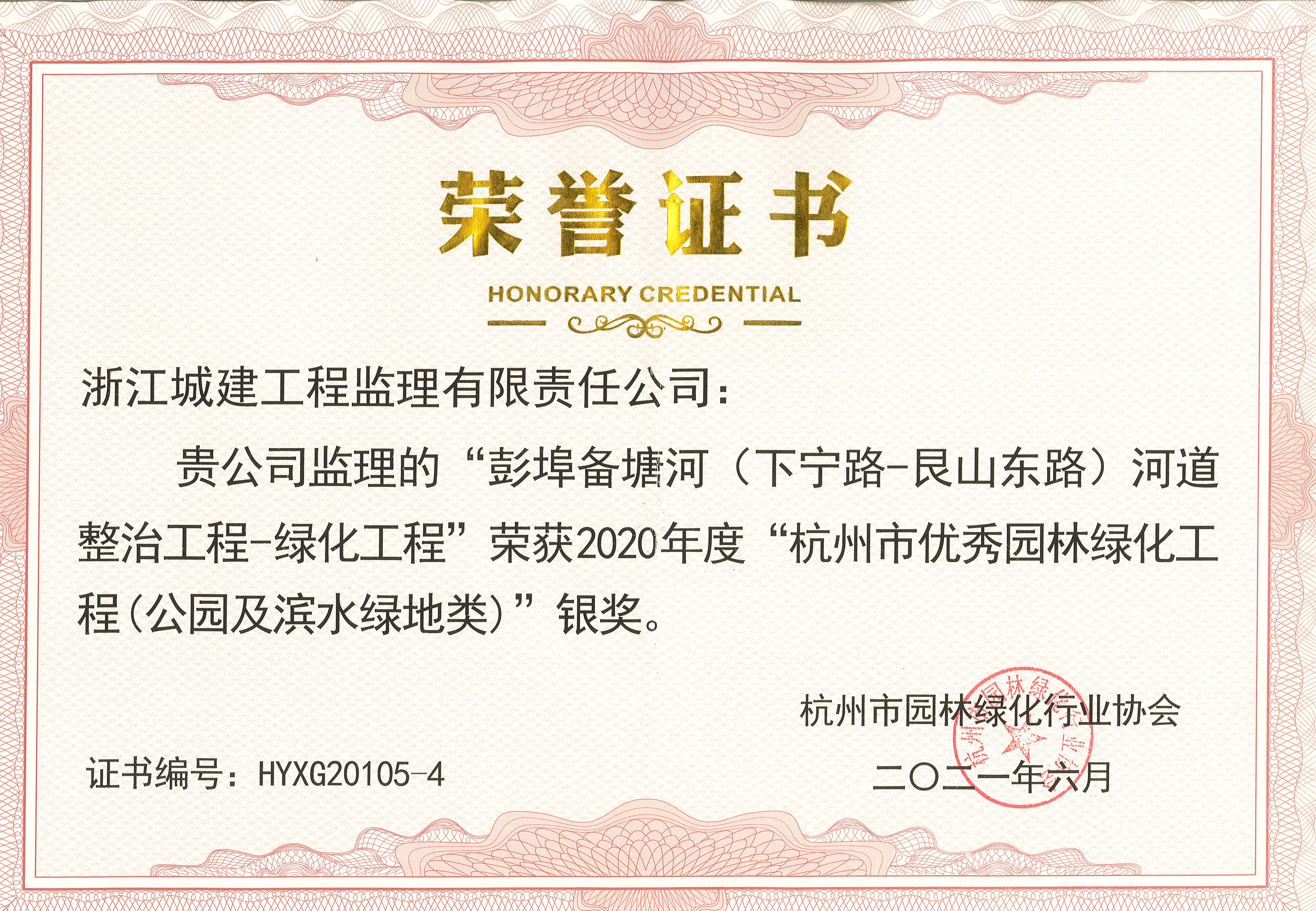 彭埠备塘河(下宁路—艮山东路)河道整治工程—绿化工程——荣获2020年度“杭州市优秀园林绿化工程(公园及滨水绿地类)“银奖”
