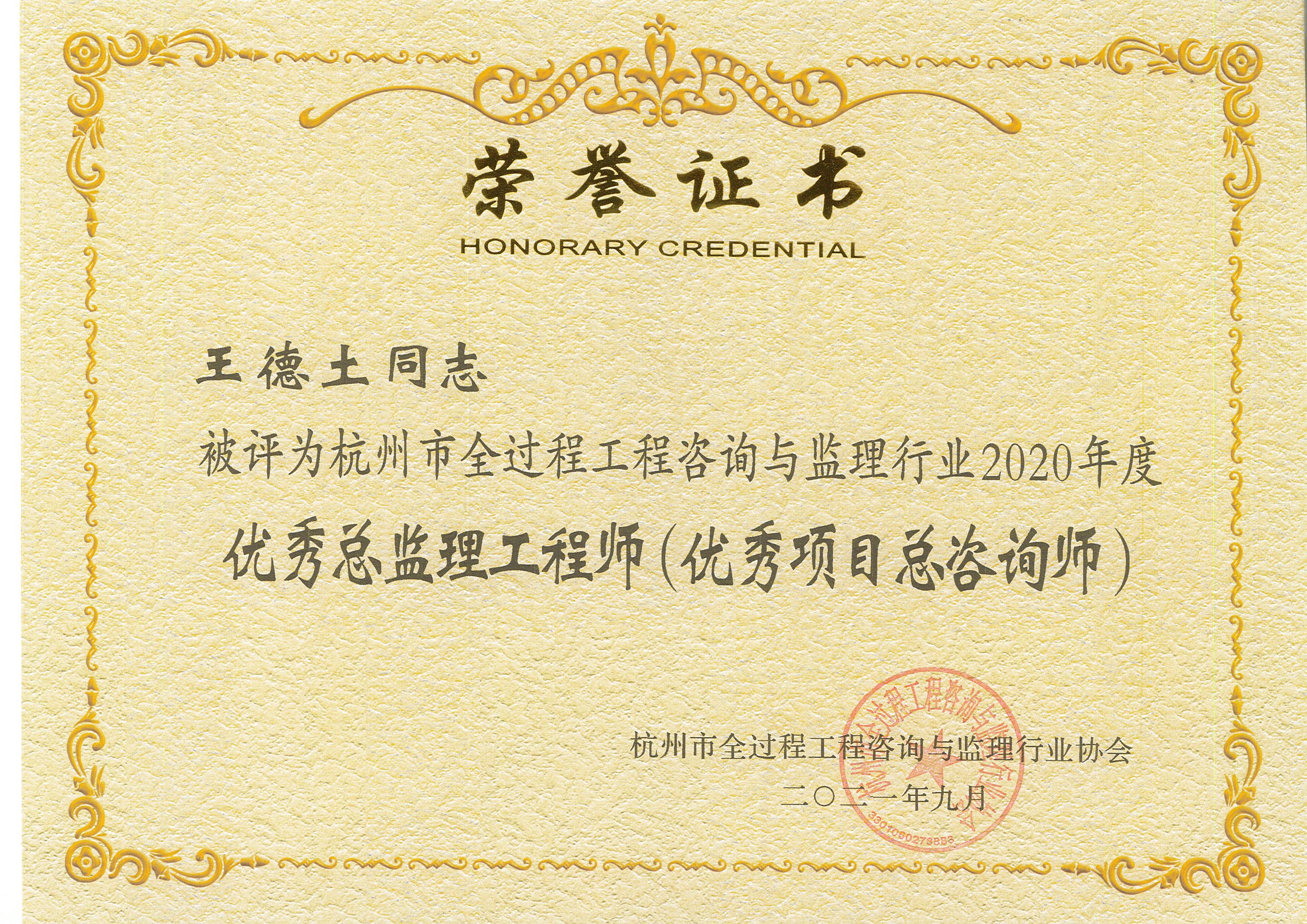 2020年度杭州市优秀总监理工程师(优秀项目总咨询师):赵广文、王德土
