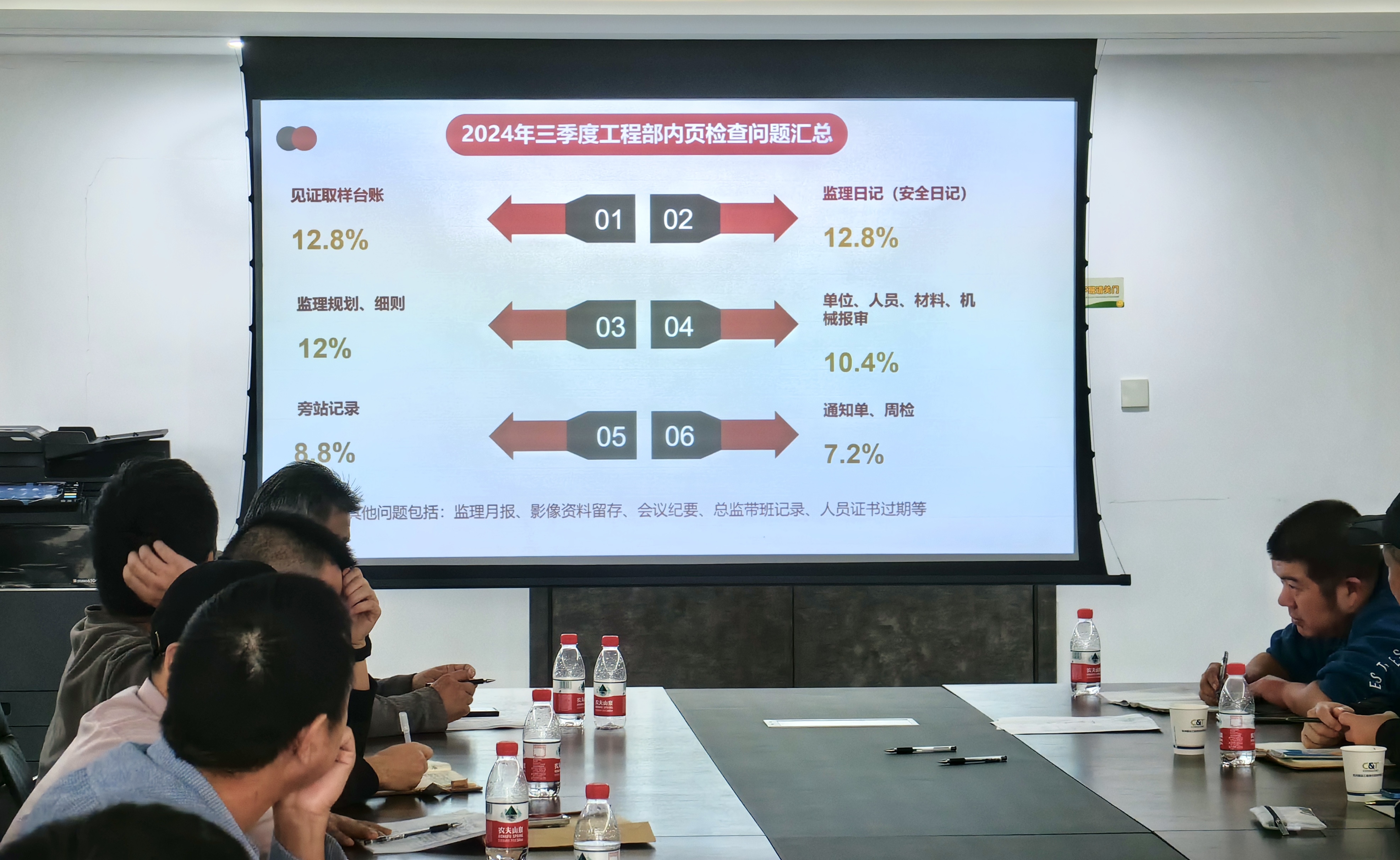 会议首先回顾了近期举行的大会和培训,由工程部汇报第三季度各项目巡查情况,指出了现场存在的一些质量、安全和资料问题。并且,工程部还对季度检查出现的问题进行了数据汇总计算,统计了重点问题发生百分比,提醒各项目未来应着重留意这些易出现异常的方面。除此之外,工程部还对下季度将要举行的培训或会议进行了梳理。