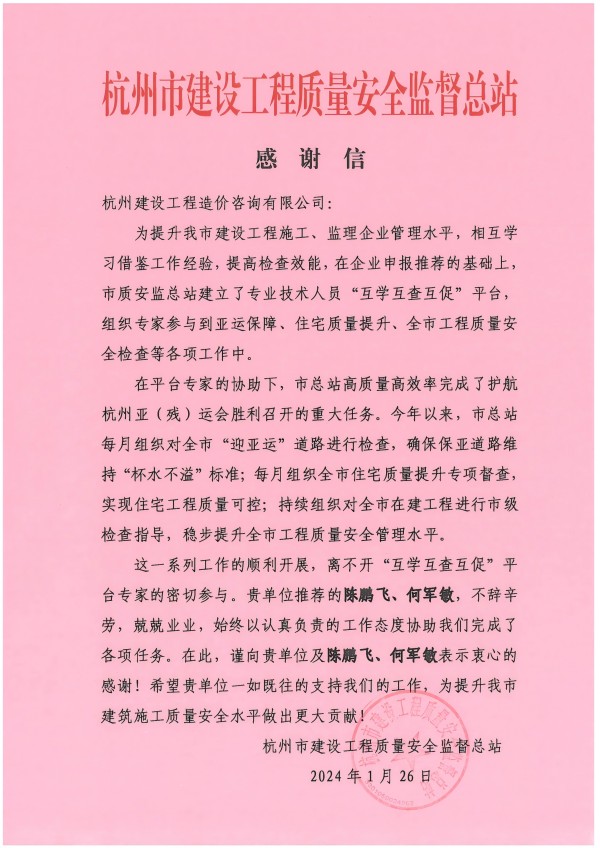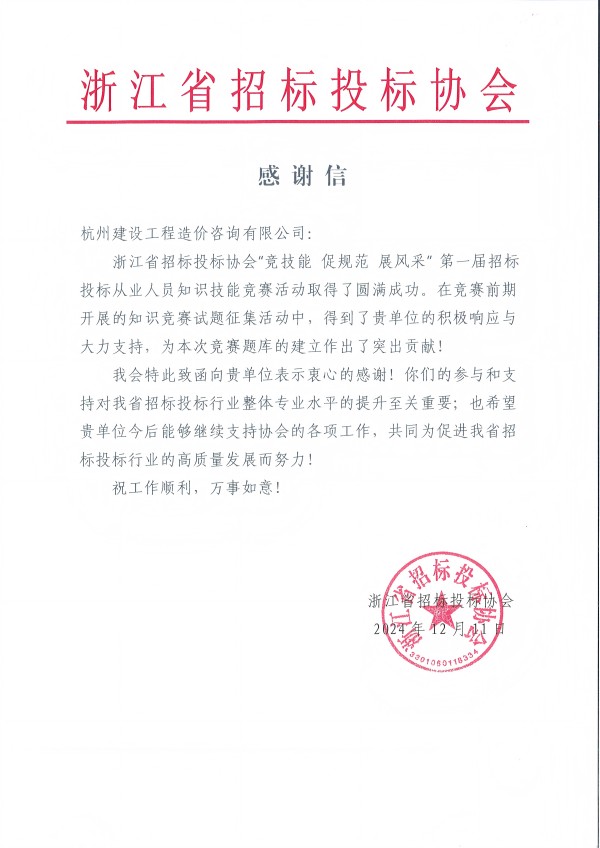 浙江省招标投标协会“竞技能 促规范 展风采”第一届招标投标从业人员知识竞赛试题征集活动感谢信