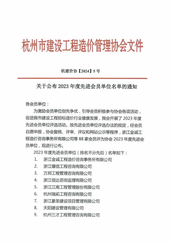 杭州市临安区建筑行业协会2024年度协会先进会员单位