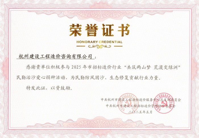 2025年市招标造价行业“共筑两山梦 荒漠变绿洲”民勤治沙爱心捐种活动荣誉证书