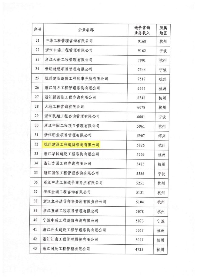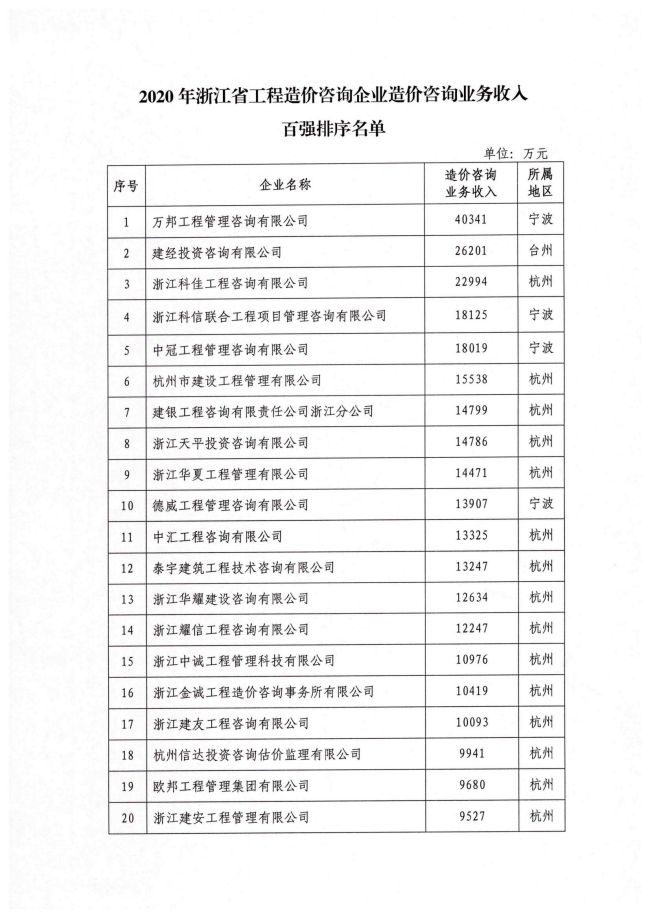 2020年浙江省工程造价咨询企业造价咨询业务收入百强